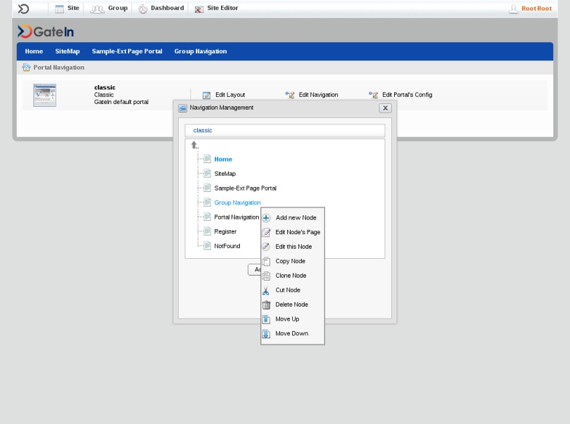 Content managers can manipulate navigation nodes through this interface and reorganize the menus